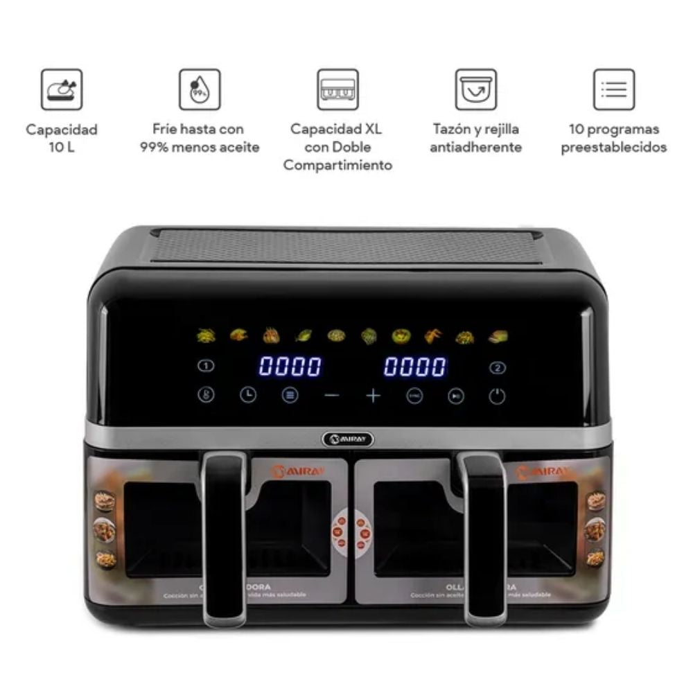 - Capacidad XL de 10 litros con doble compartimiento, para preparar dos alimentos al mismo tiempo sin mezclar sabores.