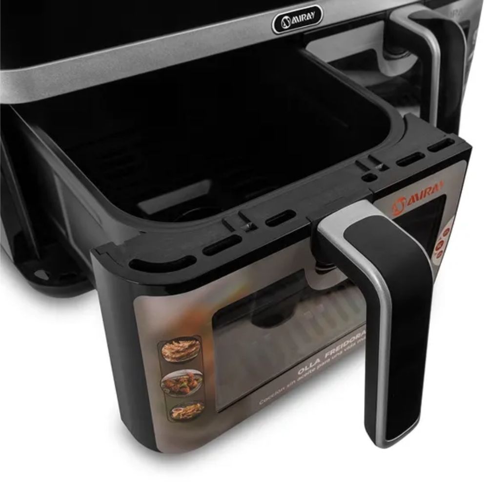 - Tecnología de aire caliente que permite freír con hasta 99 % menos grasa, logrando platos crujientes por fuera y jugosos por dentro.