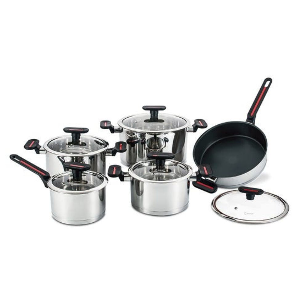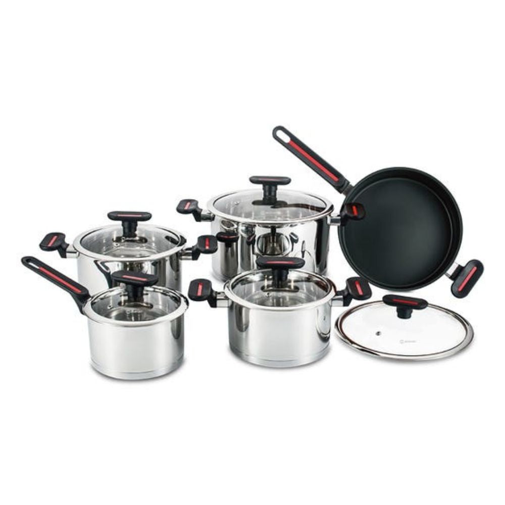 - Set compuesto por 10 piezas que cubren diversas necesidades de cocción: ollas, cacerola y sartén con sus tapas.