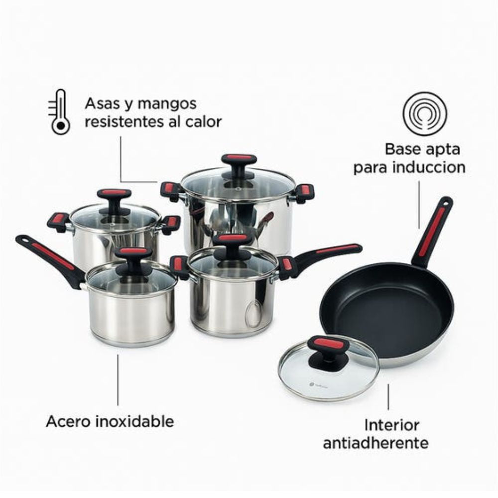 (Total: 10 piezas entre ollas, cacerola, sartén y tapas).
